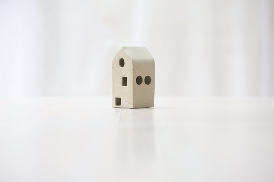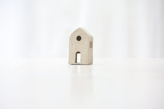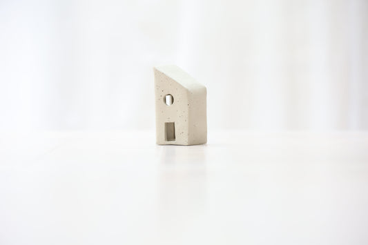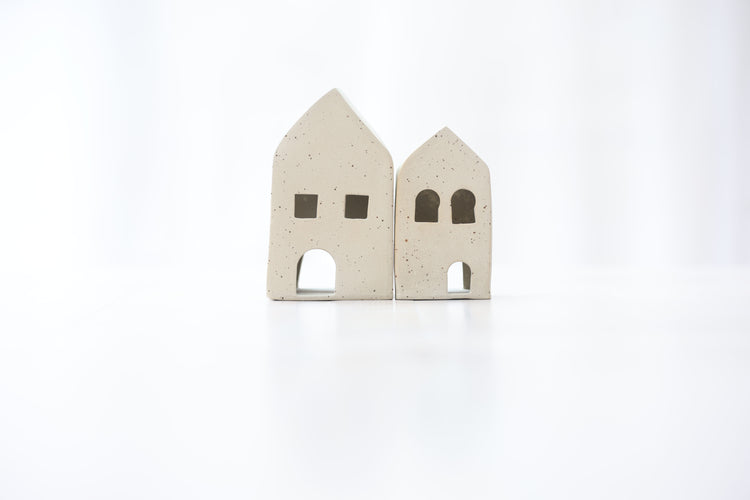 Collection de petites maisons photophores en grès blanc pyrité pour illuminer les longues soirées d’hiver!